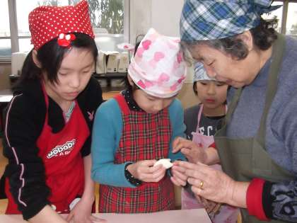 おばあちゃんたちがこねあげた生地を使って,皮作りにも挑戦!