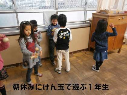朝休みに教室をのぞいてみたら,1年生が「お手玉」「こま回し」「けん玉」などで遊んでいました。