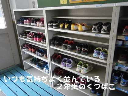 2年生のくつ箱は,いつ見ても,くつが整然ときれいに並んでいます。他学年もそれなりにきちんと整頓はされているのですが,2年生のくつ箱は特別です。見事にくつが並んでいます。
