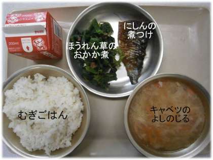 「むぎごはん」「キャベツのよしのじる」