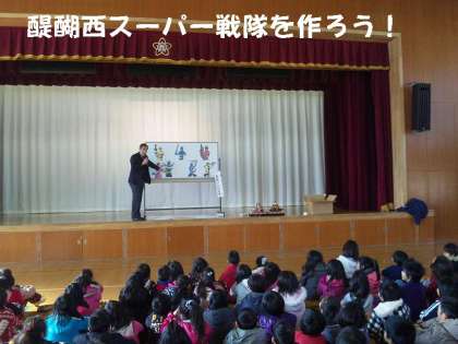 また,低学年向きには,スーパー戦隊シリーズのお話をされ,醍醐西小学校の平和(楽しい学校にする)のために,みんなで協力してチームを組んで,「醍醐西スーパー戦隊を作ろう」というお話でした。