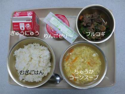 今日の献立は,『中華コーンスープ』『プルコギ』『麦ご飯』『りんごゼリー』『牛乳』です。