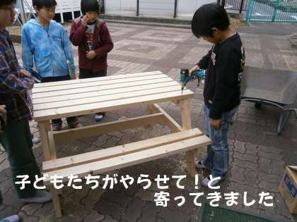 昨日は試作品を作っていたところに,「ぼくも作りたい」「わたしにもやらせて」と子どもたちが集まってきました。