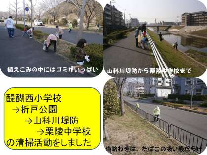 昨日は,びっくりするような暖かい日になりました。気温は20度をこえていたようです。花粉や黄砂の影響も多々ありましたが,10時に多くの地域のみなさん,保護者,先生,そして,子どもたちが集まり,栗陵中学校までの清掃活動に出発しました。
