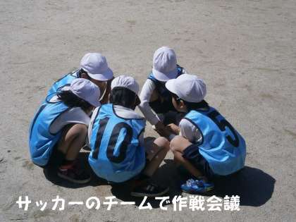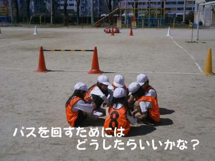 今日は,1年生の体育のあと,同じコートを使ってサッカーをしました。試合の前に,班ごとに作戦会議を設けて取り組みました。