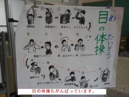 今日は2年生の視力検査でした。後期になって目が見えにくくなっている人はいませんか?視力は遺伝するとも言われていますが,しっかり予防することで視力低下を防ぐことができます。 学校で習った「目の体操」や遠くの緑を見つめる「遠望視」などをこまめに続けることが大事ですね。