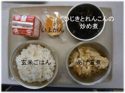 「あげ玉煮」の中に,春においしい「みつば」が入っていました。1本の茎に葉が3枚ずつつくことから「三つ葉」という名前になりました。歯ざわりがよく,さわやかな香りが料理を引き立てます。
