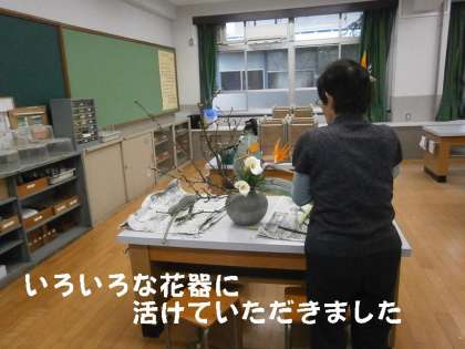 学校にあるいろいろな形の違った花器に合わせて,巧みに活けていただきました。