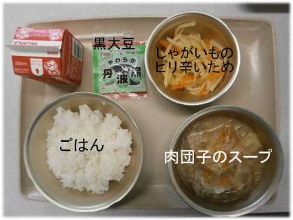「ごはん」「肉団子のスープ煮」「じゃがいものピリ辛いため」「黒大豆」