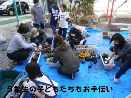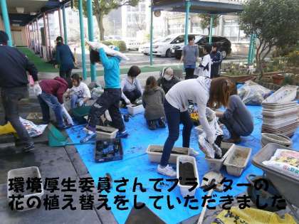 午後からPTA環境厚生委員のお母さん方に来ていただき,玄関前のプランターの花の植え替え作業をしていただきました。