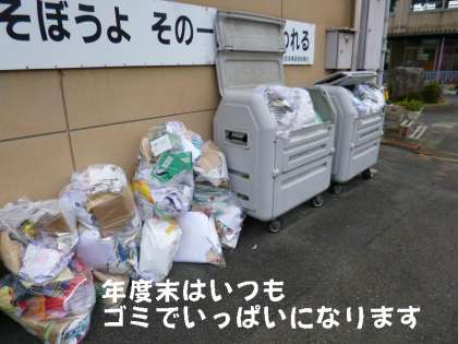 事務処理をはじめ,教室や職員室の掃除,書類の整理整頓などで動き回っています。当然,この時期は,ゴミの山ができます。コンテナボックスに入りきらないゴミ袋がいくつも積んであります。ゴミの分別にも気をつかいます。燃えるゴミ,燃えないゴミの分別だけでなく,個人情報などは,秘密書類としてシュレッダーにかけたり,特別回収してもらったりしています。