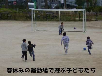 春休みに入って静かだった運動場ですが,今日は,子どもたちが遊びにきました。普段は子どもたちでいっぱいの運動場を,数人で広々と使ってサッカーをしていました。