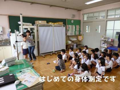 保健室の先生から,「保健室はどんなところ?」「身体検査(測定)ってなにするの?」「・・・・?」といろいろなお話を聞いてから,くつ下をぬいで身長・体重・座高等を測ってもらいました。