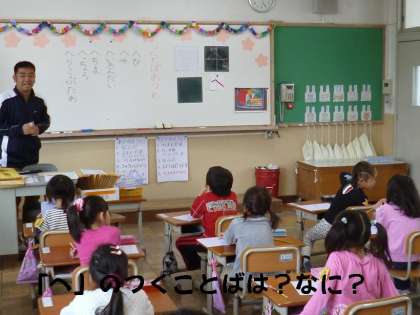 「へ」のつくものはなにかな?の質問に,「ヘび」「へちま」「へいきんだい」「へそ」「へりこぷたあ」など,子どもたちが言ってくれました。