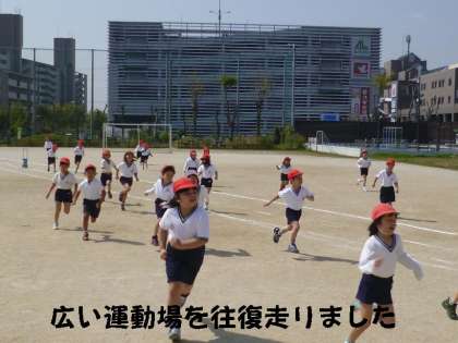 真新しい体育の服を着た1年生が,準備運動として,元気に運動場の端から端まで走りました。