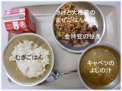 「金時豆の甘煮」「キャベツのよしの汁」「牛乳」