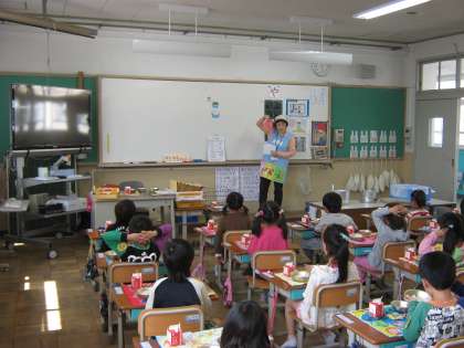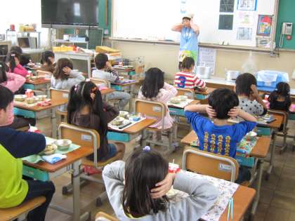 今日は、栄養教諭の先生から初めて食育の授業を受けました。食感を耳に手を当て、音で感じたり楽しく活動できました。給食もおいしく食べられました。