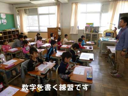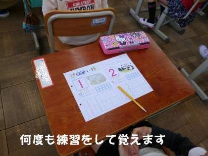 今日は,1から5の数字の勉強をしました。声を出して先生と一緒に何度も言ったあと,書く練習をしました。