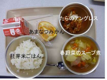 「胚芽米ごはん」「春野菜のスープ煮」