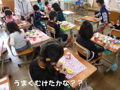 1年生は少し苦労していましたが,入学式のときに校長先生からの「自分のことは自分でしよう!」という約束を守って,一生懸命,皮むきに挑戦していました。でも,皮むきの経験のない子どもたちが多かったので,先生が4〜5人入って教えていました。