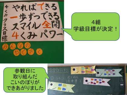 4組さんの教室をのぞくと,大きく学級目標がはり出されていました。みんなで考えた目標です。そして,白板には,参観日でがんばった「こいのぼり」が4匹泳いでいました。