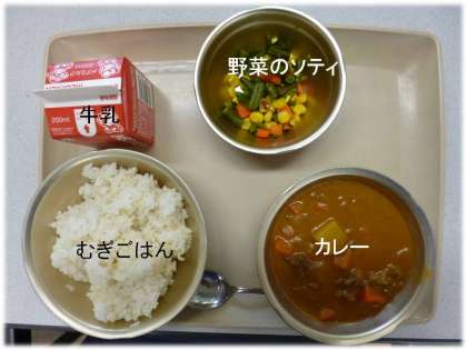 「むぎごはん」「カレー」「野菜のソティ」「牛乳」