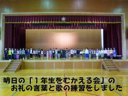 明日,児童会主催の「1年生をむかえる会」が実施されます。各学年からのお祝いの言葉やクイズなどの出し物がありますが,そのお礼に,1年生全員で「お礼の言葉」や「歌」の練習をしていました。
