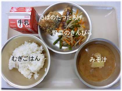 「むぎごはん」「みそ汁」「さばのたつたあげ」「野菜のきんぴら」