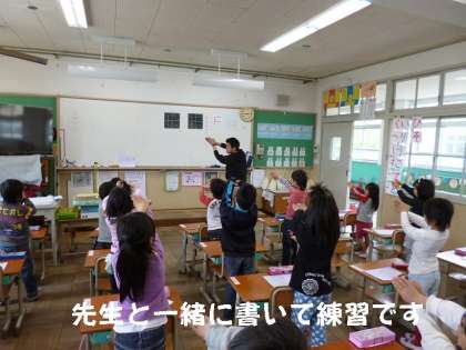 今日のひらがな練習は「に」です。先生と一緒に何度も練習したあと,プリントに書いて覚えます。そして,「に」のつく言葉をたくさん発表しました。