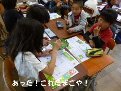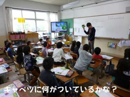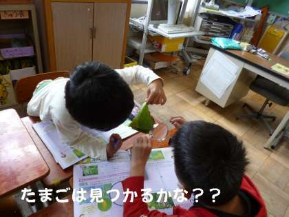 理科の時間に,先生がキャベツの葉っぱを持ってきました。今日は,モンシロチョウのたまごみつけをしました。