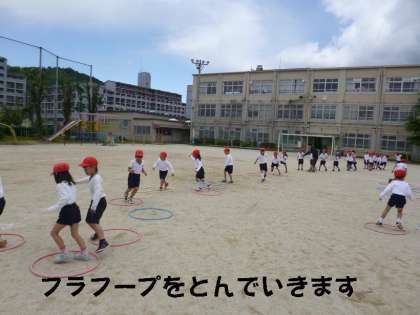 2年生の体育では,「とびくらべ」はゴムひもとびでしたが,1年生は,運動場いっぱい使ってフラフープや輪っかをとんでいく「とびくらべ」です。