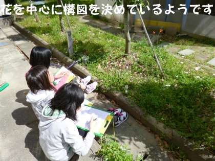 自分の好きな景色をバックに春の写生をします。きれいな花を中心に持ってきて構図を決めている子どもたちもいます。