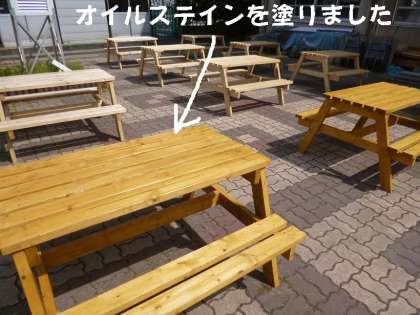 先週の3連休で作った野外テーブルに,オイルステイン(木質保護着色剤)を塗り始めました。