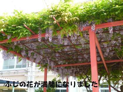 中庭の藤棚の藤の花が満開になりました。とてもきれいです。連休明けまではこのまま満開状態が続くと思います。