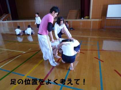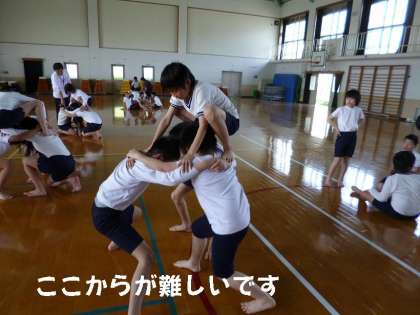 当然のことながらうまくできません。立ちあがることのできないグループも多々ありました。でも,これから計画的に練習して,運動会当日には,みんなをあっと言わせる演技を完成させたいと思っています。