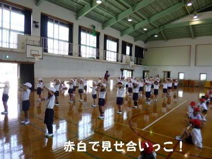 運動会に向けて,合同体育の時間が多くなってきました。今日はダンスの最初の部分を全員で合せました。