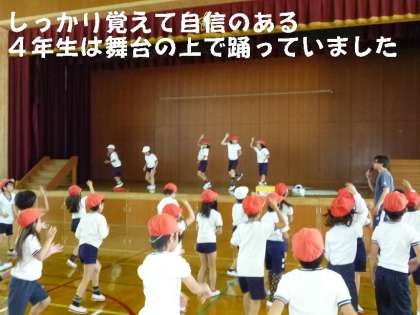今日も合同体育で「エイサ」を踊りました。すっかり動きを覚えて自信のある4年生は,自ら舞台の上に上がって踊りました。時間が経つにつれて,舞台の上の人数が多くなっていました。