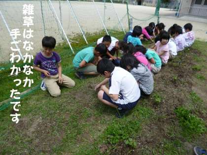 今日は,畑作りのため,学習園の雑草抜きをがんばりました。うまく根っこから抜けずに,途中で切れてしまう雑草もあり,手こずりましたが,いつでも苗植えができる状態までがんばりました。
