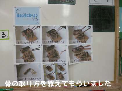 1年生は栄養教諭の北山先生に,上手な魚の食べ方(骨の取り方)を教えてもらい,上手におはしで取っていました。