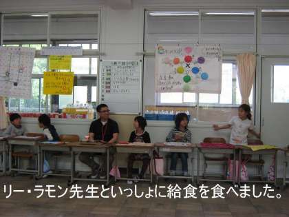 今日は、ALTのリー・ラモン先生が来校されていたので、3年生といっしょに給食を食べて交流しました。