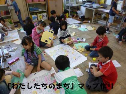 ここには神社があった?ここは牛乳屋さんだよ!とみんなで楽しそうに,時間も忘れて取り組んでいます。