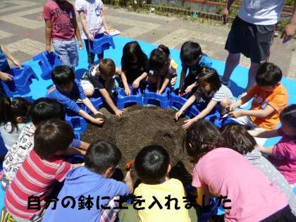 3,4校時にみんなで中庭に出てアサガオのタネまきをしました。