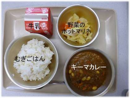 「むぎごはん」「キーマカレー」「野菜のホットマリネ」「牛乳」
