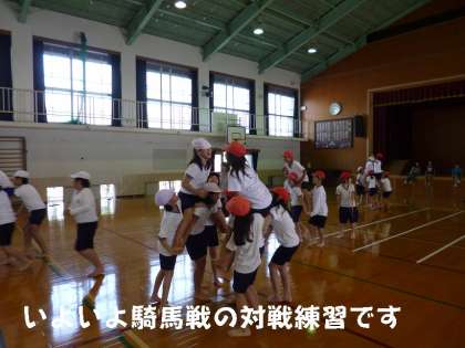 5年生は,体育館で「騎馬戦」の練習です。先週までは立ち上がるのがやっとだった騎馬が,今日はたくましい騎馬に変身していました。