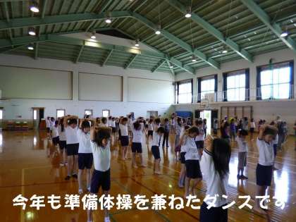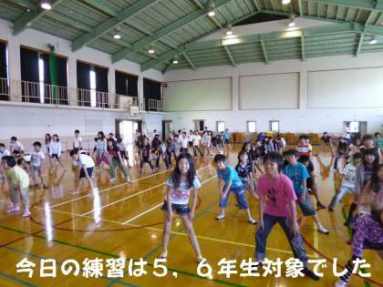 中間休み,5,6年生が体育館に集まり先生やリーダーの動きを見ながら練習しました。