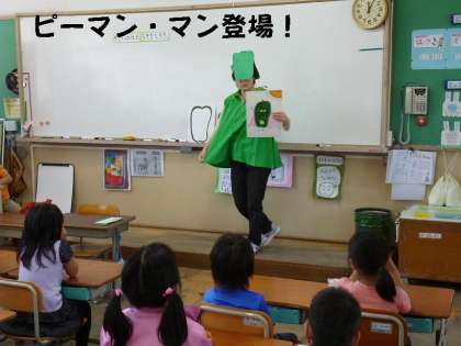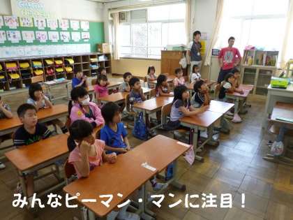 給食前に1年2組の教室に「ピーマン・マン?」がやってきました。