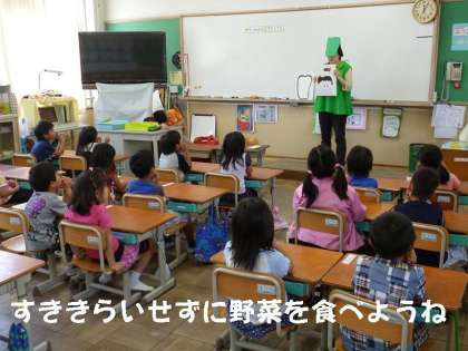 実は,栄養教諭の北山先生が,変装されていたんです。子どもたちに野菜を食べる大切さをお話してくださいました。