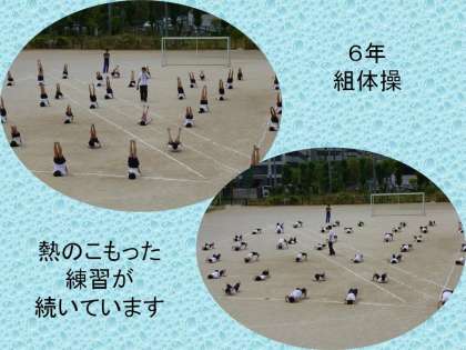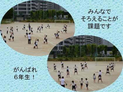 朝の児童集会後に,6年生はそのまま残って「組体操」の練習に入りました。体育館で練習してから,運動場に出て,一人〜2人技の練習をしました。