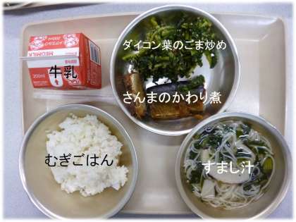 「ダイコン葉のゴマ炒め」 「牛乳」