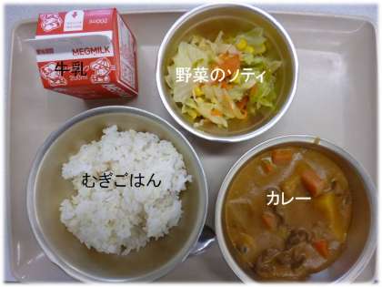 「むぎごはん」「カレー」「野菜のソティ」「牛乳」